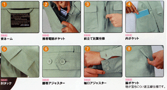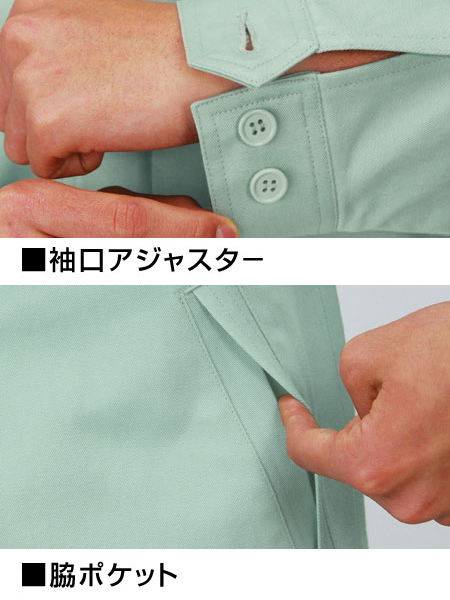 【仕様】右胸携帯電話収納ポケット、前立て比翼仕様、左胸内ポケット、左袖ペン差し、動きやすい肘タック入り、調節できる腰帯アジャスター付き(2ボタン)、調節できる袖口アジャスター付き(2ボタン)、脇ポケット逆玉縁仕様(物が落ちにくい)