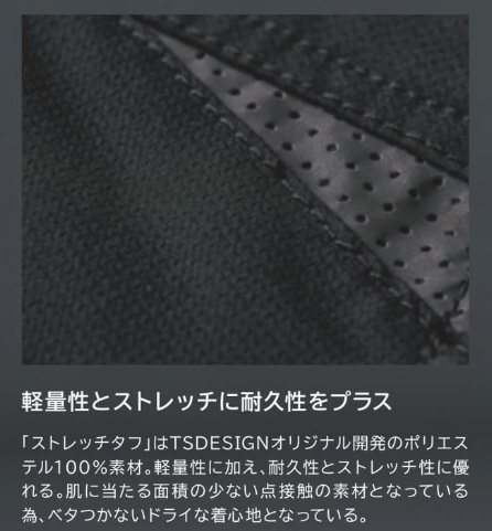 「ストレッチタフ」はTSDESIGNオリジナル開発のポリエステル100%素材。