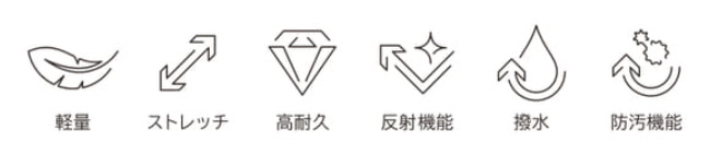 【機能】軽量、ストレッチ、高耐久、反射機能、撥水、防汚機能