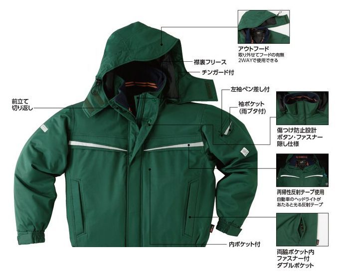 【仕様】前立て切り返しで雨や冷気を遮断、襟裏フリース、アウトフード(取り外し可能)、前ファスナー・ボタン隠し仕様、内ポケット付、両脇ポケット内ファスナー付ダブルポケット、内ポケット付、左袖ペン差し付、袖口マジックテープ仕様+ゴム仕様