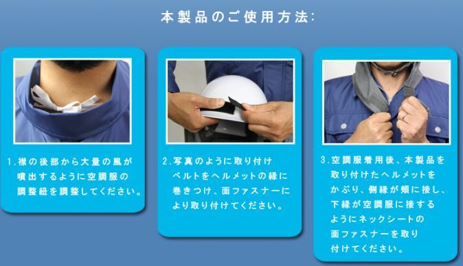 (3)空調服着用後、本製品を取り付けたヘルメットをかぶります。その際、即縁がほほに接し、下縁が空調服に接するようにネックシートの面ファスナーを取り付けて下さい