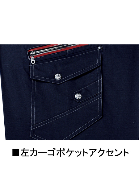 【仕様】ノータックカーゴパンツ、カラビナループ、タックボタン、左右太ももデザインファスナー、右太ももデザインボタン、左カーゴポケットアクセント、消臭&抗菌テープ(左右内もも)、裾パンツ紐通し穴
