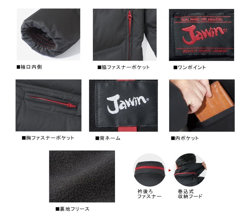 【仕様】フード付防寒ジャンパー、背ネーム、胸ファスナーポケット、裏地フリース、衿後ろファスナー&巻込式収納フード、内ポケット、脇ファスナーポケット、ワンポイント、フロント・ポケット樹脂ファスナー