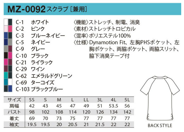 【仕様】男女兼用スクラブ、Dynamotion Fit、かぶりタイプ(肩口スナップあき)、左胸PHSポケット、左胸ポケット、両脇ポケット、両脇スリット、脇下制電消臭テープ付