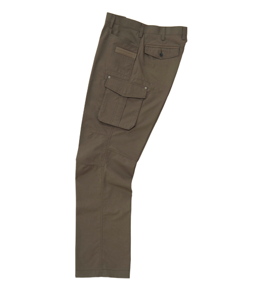 【仕様】ノータックカーゴパンツ、右脇カラビナループ、コインポケット、ミニポケット、カーゴペン差し、携帯電話ポケット、ひざダーツ、裾紐通し、サイドペン差し、左後ろフラップ付きポケット、金属ボタン(隠しドットボタン)、樹脂ボタン(後ろフラップボタン)、フロント(金属ファスナー)