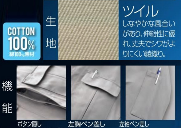 【仕様】長袖ジャンパー、左胸ペン差し、左袖ペン差し、ボタン(樹脂)