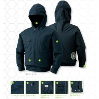 □ブルゾンデザイン:フード付き長袖ブルゾン(KU91400のフード付きタイプ)、フード内部ヘルメット用すべり止め付き、左右胸ポケット、左右脇ポケット、左袖ペン差し付、左内側バッテリー専用ポケット、右内側電池ボックス専用ポケット、袖口Wボタン、左胸ポケット雨蓋下ファスナー有り