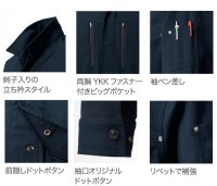【仕様】刺子入りの立ち衿スタイル、両胸YKKファスナー付きビッグポケット、前隠しドットボタン、袖ペン差し、袖口オリジナルドットボタン、リベットで補強、脇スリット