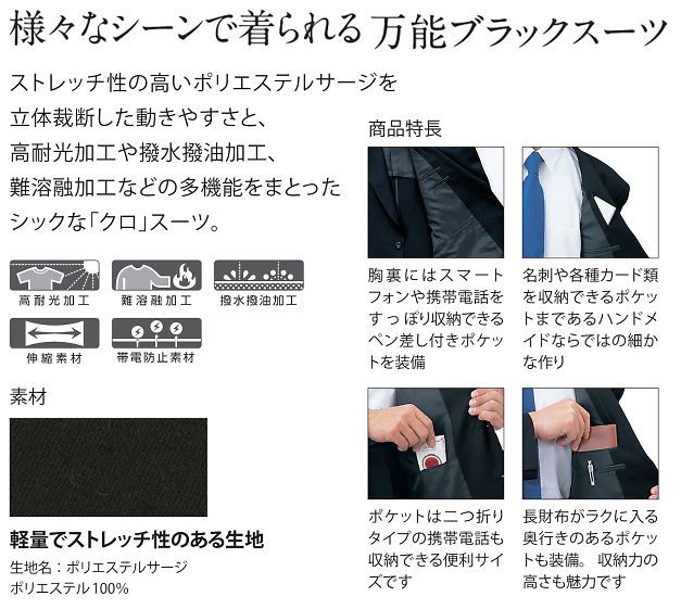 【仕様】メンズビジネスジャケット、センターベンツ、携帯電話が収納できるペン差し付ポケット、長い財布も入るポケット、名刺・カードなどの収納、シガレットポケット、樹脂ボタン