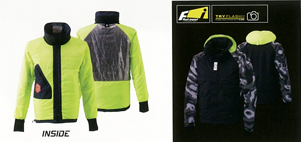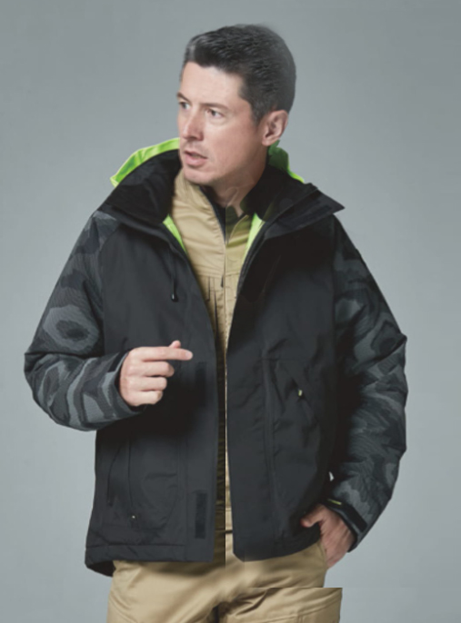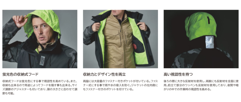 フードは蛍光色で視認性が高く、両袖は全面反射材仕様、随所に反射機能を付けており、夜間や暗がりでの作業時に活躍する仕様となっている。
