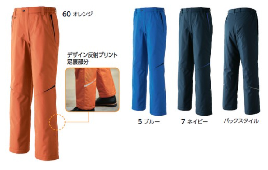 【仕様】防寒パンツ、ノータック脇シャーリング、右スルーポケット付、足裏部分/デザイン反射プリント