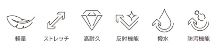 【機能】軽量、ストレッチ、高耐久、反射機能、撥水、防汚機能