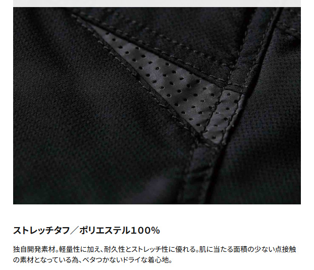 軽量性に加え耐久性とストレッチ性に優れている。肌に当たる面積の少ない点接触の素材となっている為、ベタつかないドライな着心地となっている。