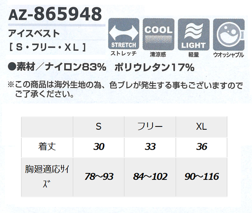□アイスベスト素材:メッシュ生地(ナイロン83%・ポリウレタン17%)、ストレッチ、ウォッシャブル