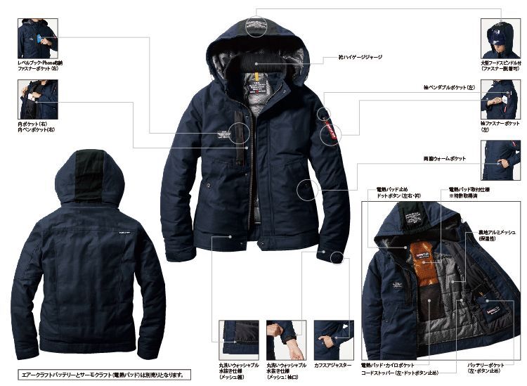 【仕様】防寒ジャケット、大型フードスピンドル付(ファスナー着脱可)、衿ハイゲージジャージ、レベルブック・Phone収納ファスナーポケット(右)、内ポケット(右)、内ペンポケット(右)、袖ペンダブルポケット(左)、袖ファスナーポケット(左)、両脇ウォームポケット、カフスアジャスター、丸洗いウォッシャブル水抜き仕様(メッシュ:裾・袖口)、電熱パッド取付仕様、電熱パッド止めドットボタン(左右・衿)、バッテリーポケット(左・ボタン止め)、電熱パッド・カイロポケット、コードストッパー(左・ドットボタン止め)