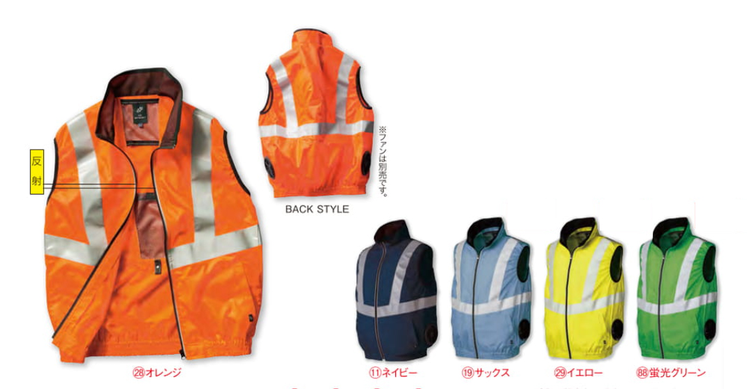 □ブルゾンデザイン:高視認反射ベスト、サイドファン仕様、前後反射テープ、内側に保冷剤用のポケット付、付属品素材(ファスナー・金属)(ボタン・樹脂)