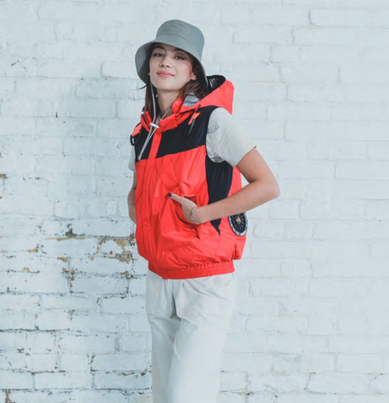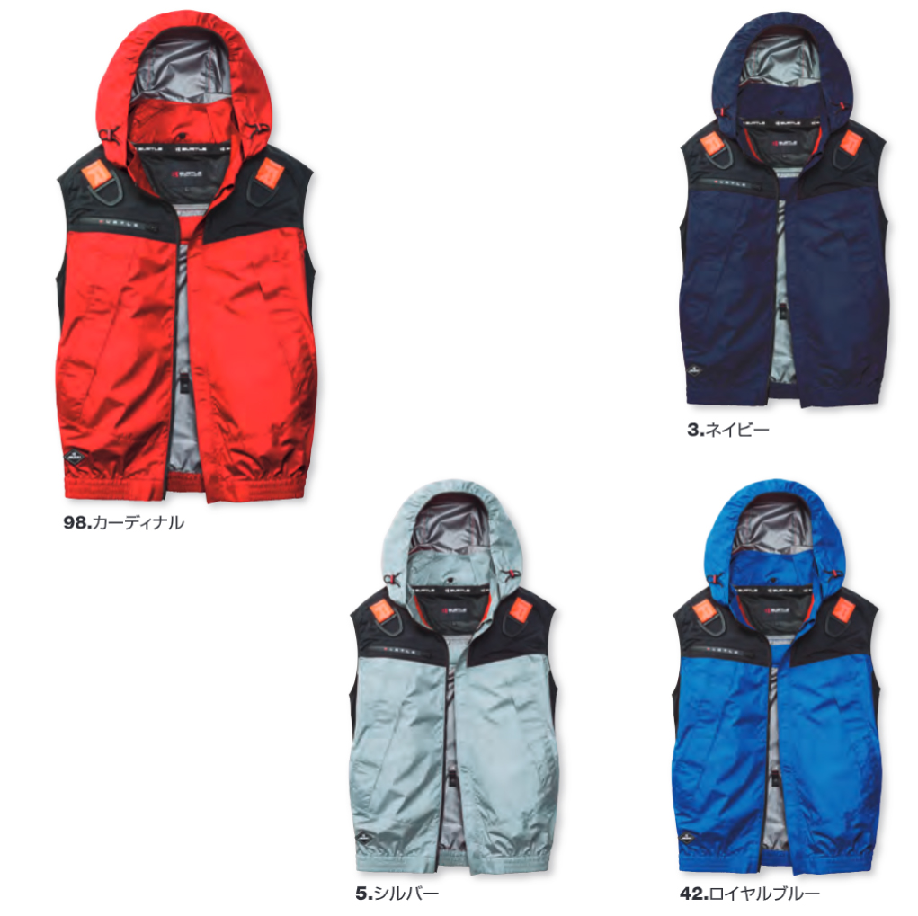 □ブルゾンデザイン:長袖ブルゾン、ローバックファン、ノーフォーク、大型フードスピンドル付き(ボタン止め着脱仕様)、フードプリント、両肩ハーネス用フックハンガー(収納可)、両脇ポケット、衿ダイレクトエアー、バッテリー収納ポケット(左・マジックテープ止め)、コードホール、コードループ、コードストッパー(ドットボタン止め)、背ファン取付口、ランヤード取付口
