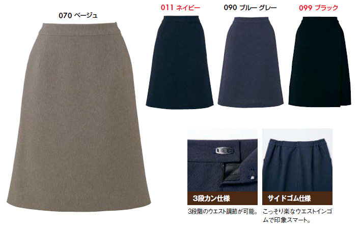 【仕様】レディースAラインスカート、両脇ポケット、3段カン仕様(3段階のウエスト調節が可能)、両脇ゴムシャーリング(こっそり楽なウエストインゴムで印象スマート)