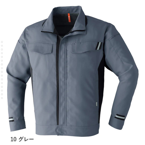 【仕様】長袖ブルゾン、背裏メッシュ仕様、両袖ペン差し付、左胸ペン差し付、左胸野帳対応ポケット、衿配色仕様、左胸IDカードホルダーループ、両脇消臭テープ付、ノーフォーク、片布付、ファスナー(樹脂)、ボタン(樹脂)