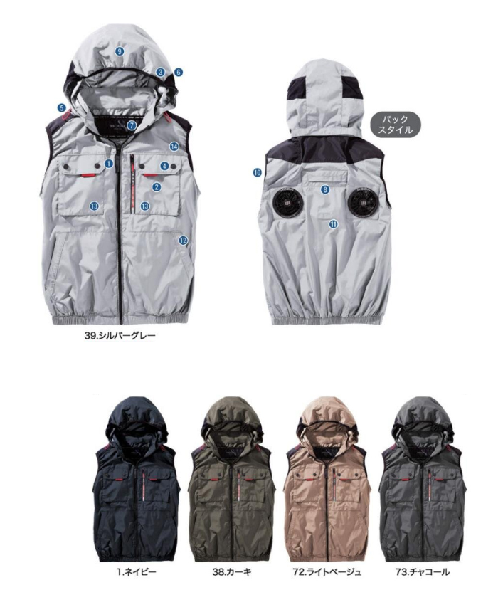 □ブルゾンデザイン:ベスト、ロゴ入りフロントファスナー、左胸二重ポケット、フードストレッチパイピン、2丁掛け対応フック掛け、フードゴムスピンドルストッパー、耳部分綿冷感コンプレッション、ダクト(首元)、ランヤード取り出し口、左胸プリントファスナー、フード取り外し可、ノーフォーク、ケーブル止め(ドット釦タイプ)、左脇ケーブル通しゴム、胸ペン差し、左右胸ポケットコード通し穴、アームホール高品質ニットパイピン、ファスナー付きバッテリーポケット