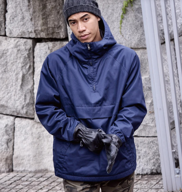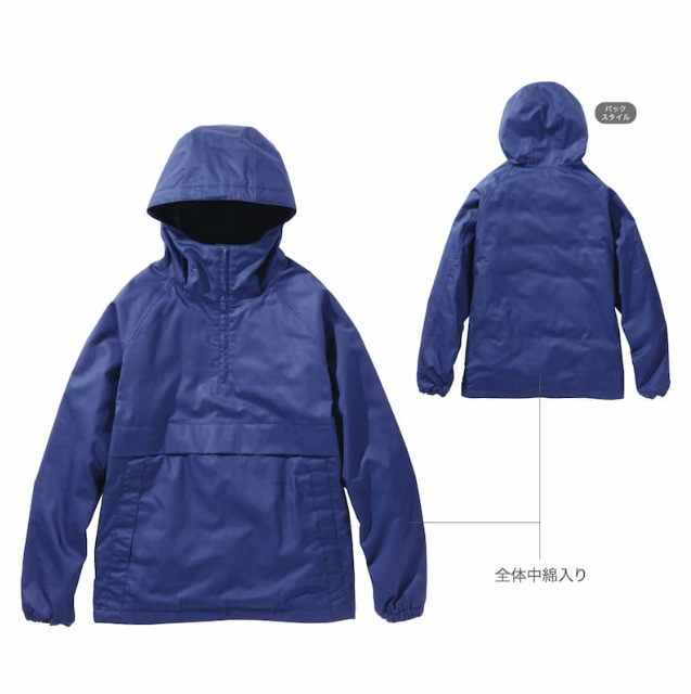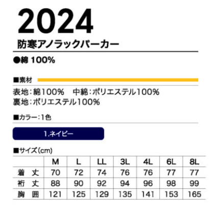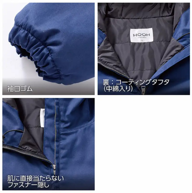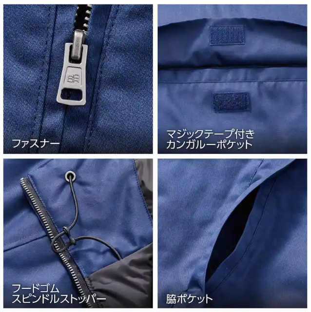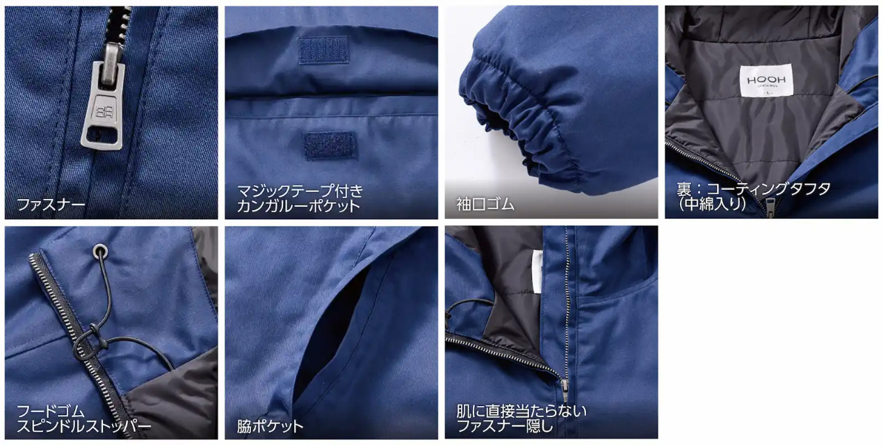 【仕様】防寒アノラックパーカー、全体中綿入り、マジックテープ付カンガルーポケット、フードゴムスピンドルストッパー、胸ポケット、袖口ゴム、裏コーティングタフタ(中綿入り)、肌に直接当たらないファスナー隠し
