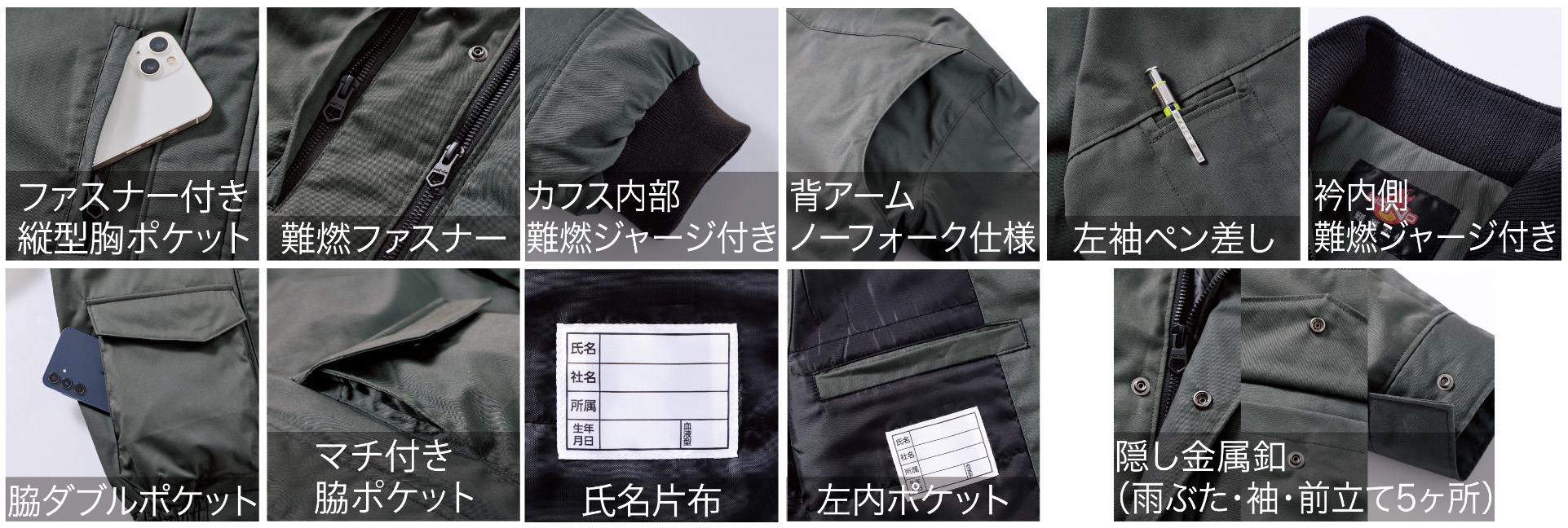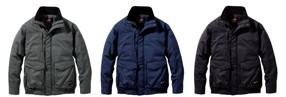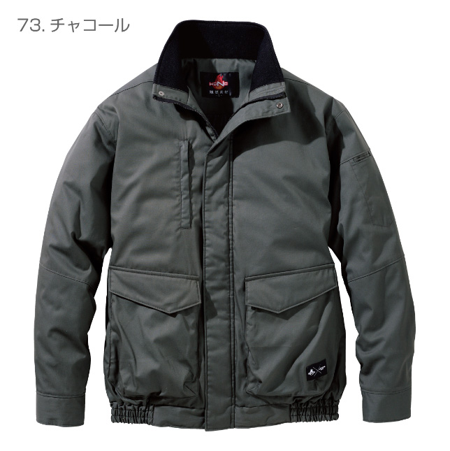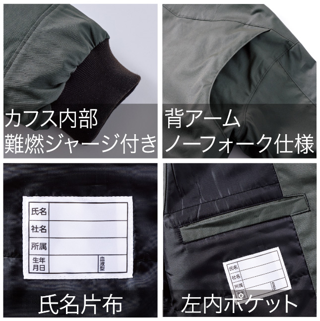 【仕様】ファスナー付き縦型胸ポケット、脇ダブルポケット、マチ付き脇ポケット、難燃ファスナー、左袖ペン差し、衿内側難燃ジャージ付き、隠し金属釦(雨ぶた・袖・前立て5ヶ所)、カフス内部難燃ジャージ付き、背アームノーフォーク仕様、左内ポケット、氏名片布、保温裏アルミ(ブラック)