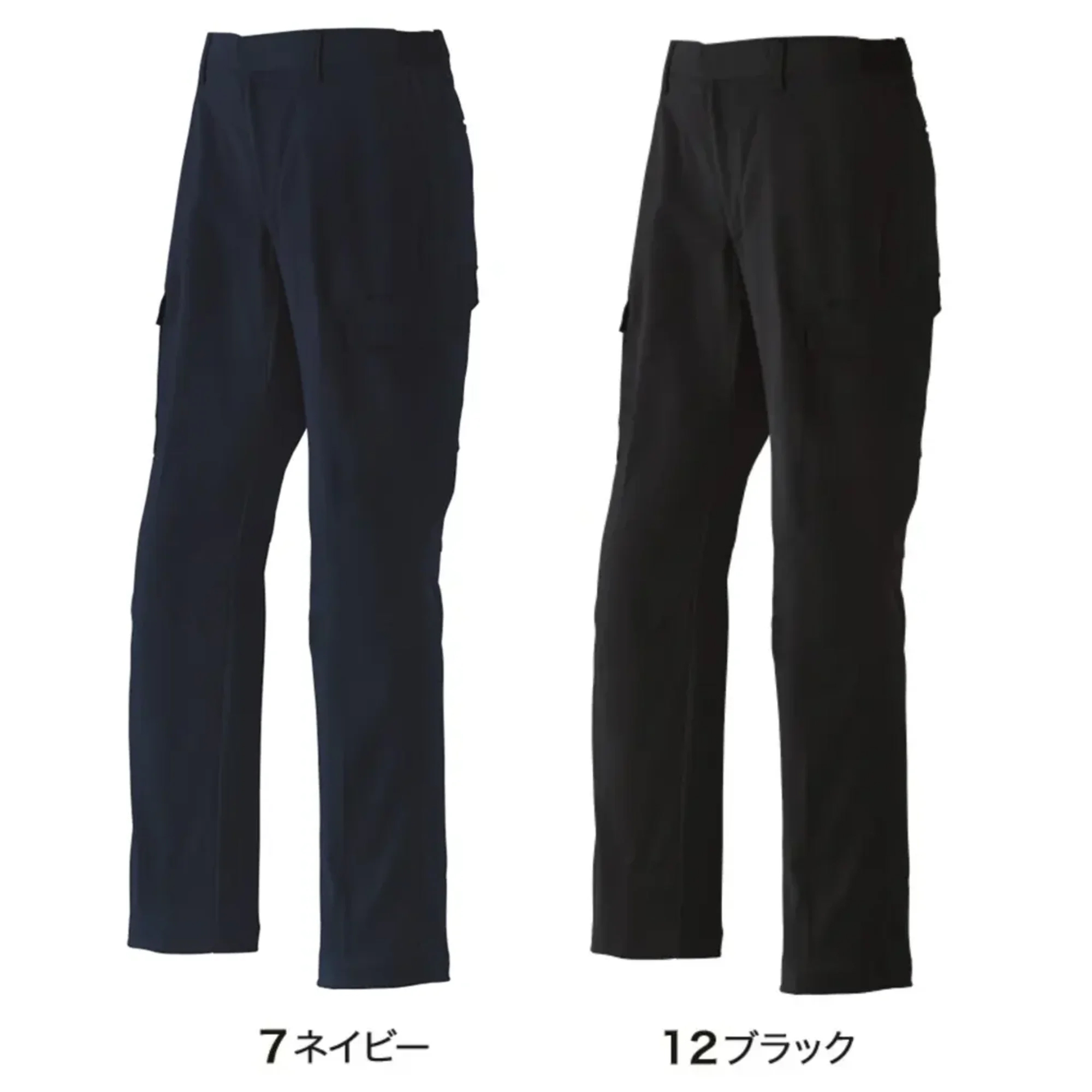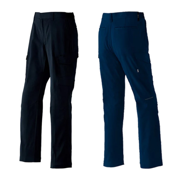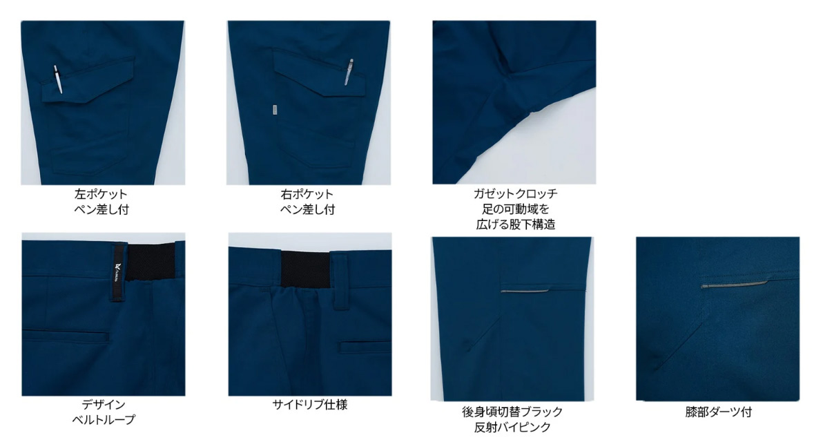 【仕様】ノータックカーゴパンツ、ベルトループ、サイドリブ仕様、ガゼットクロッチ(足の可動域を広げる股下構造)、左右ポケットペン差し付き、膝部ダーツ付、後身頃切替反射パイピング、片布付、日本製生地