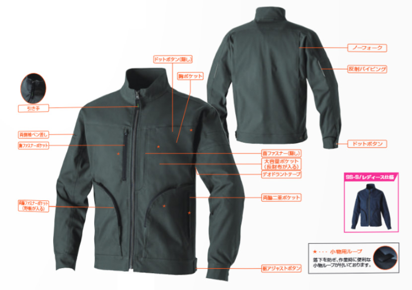【仕様】長袖ブルゾン、ノーフォーク、腕部反射パイピング、両側袖ペン差し、胸ファスナーポケット、両脇ファスナーポケット(野帳が入る)、胸ポケット/ドットボタン(隠し)・面ファスナー(隠し)、大容量ポケット(長財布が入る)、脇デオドラントテープ、両脇二重ポケット、裾アジャストボタン、袖口ドットボタン、樹脂ファスナー、ドットボタン/金属
