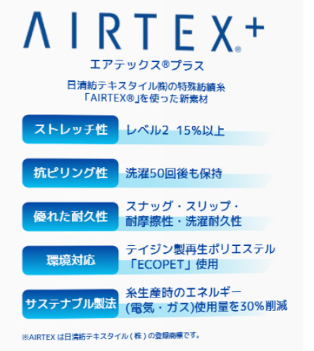 ▼日清紡の特殊紡績糸「AIRTEX🄬プラス」による優れたストレッチ性・抗ピリング性・耐久性