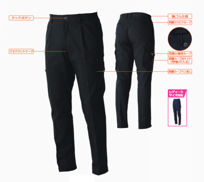 【仕様】カーゴパンツ(ワンタック)、脇ゴム仕様、両側カラビナループ、デオドラントテープ、両側カーゴポケット(野帳が入る)、両側カーゴペン差し、両側小物用ループ、フロントファスナー・ドットボタン・タックボタン/金属