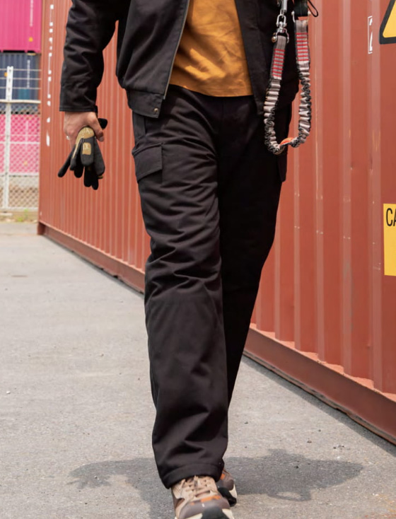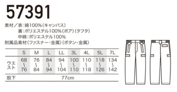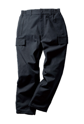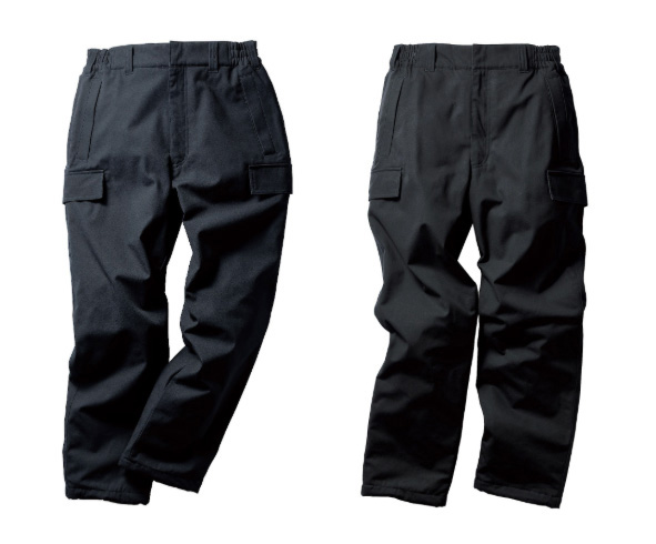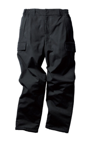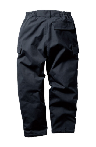 【仕様】防寒パンツ、前立てドットボタン隠し、左右雨蓋付カーゴポケット(ドットボタン隠し)、左右脇物が落ちにくい逆ポケット、脇シャーリング、右脇スルーポケット、両裾ドローコード、右後雨蓋ポケット(ドットボタン隠し)、ファスナー(金属)、ボタン(金属)