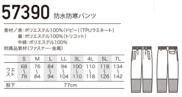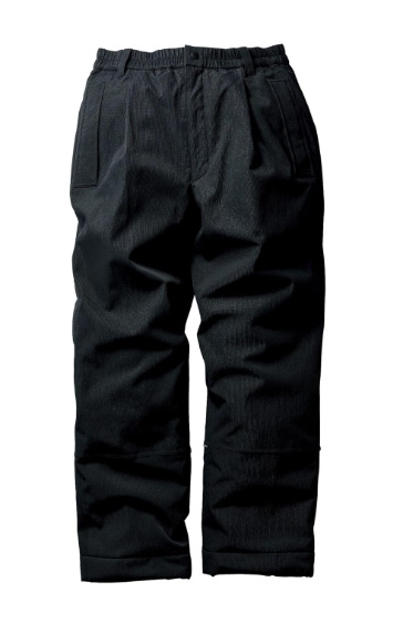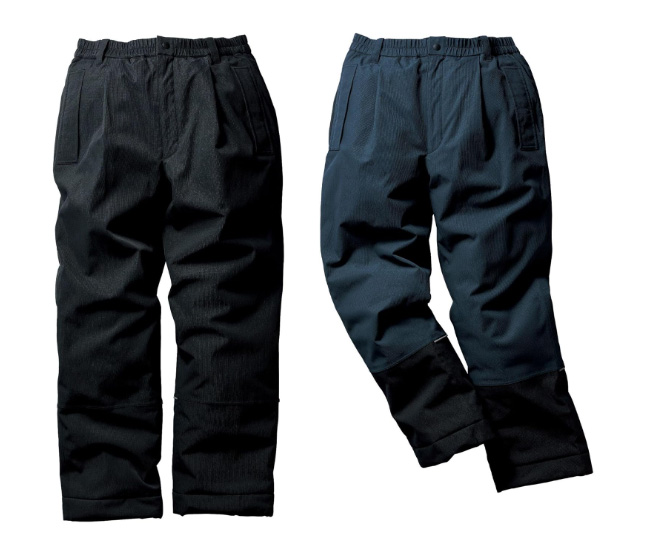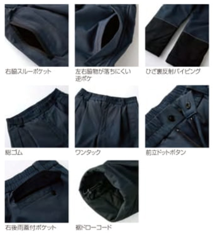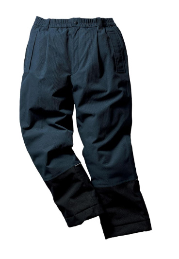 【仕様】防水防寒パンツ、ひざ裏反射パイピング、前立てドットボタン、左右脇物が落ちにくい逆ポケット、ワンタック、裾ドローコード、右脇スルーポケット、ウエスト総ゴム、右後雨蓋付ポケット