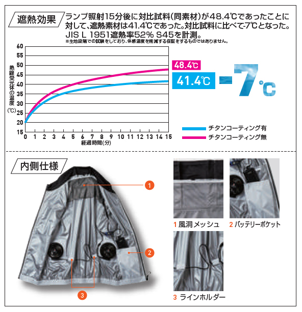 ★裏チタンコーティングの遮熱生地を使用(遮熱率52% S45)