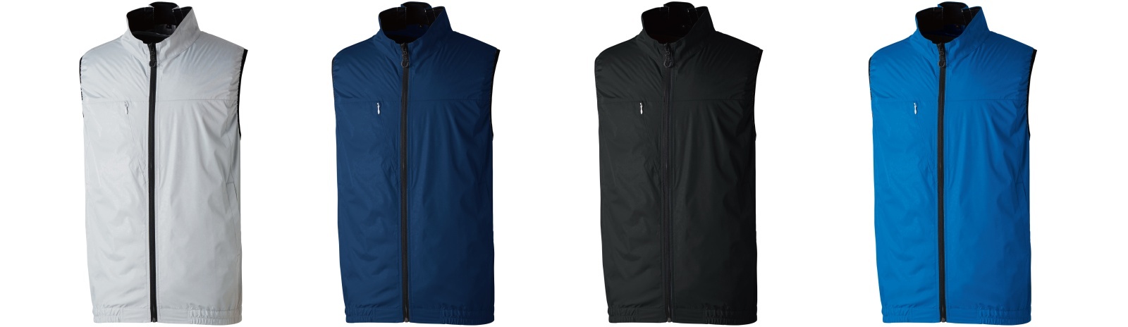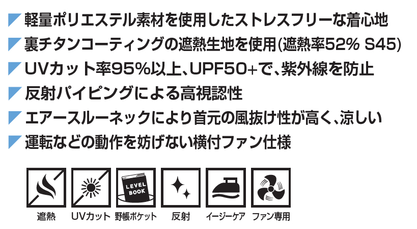 □ブルゾンデザイン:ベスト、エアースルーネック、衿裏メッシュ、横付ファン、ファスナー引手、胸ファスナーポケット(野帳が入る)、反射パイピング(背)、ファン取付孔(直径約90mm)、ウエストゴム仕様、両側脇ポケット、裏チタンコーティング生地、風洞メッシュ、内側バッテリーポケット、ラインホルダー、樹脂ファスナー