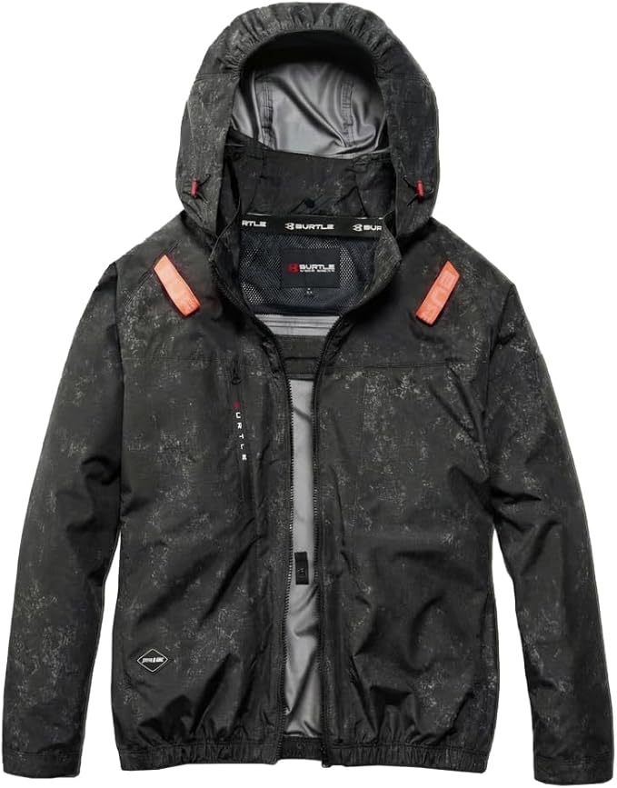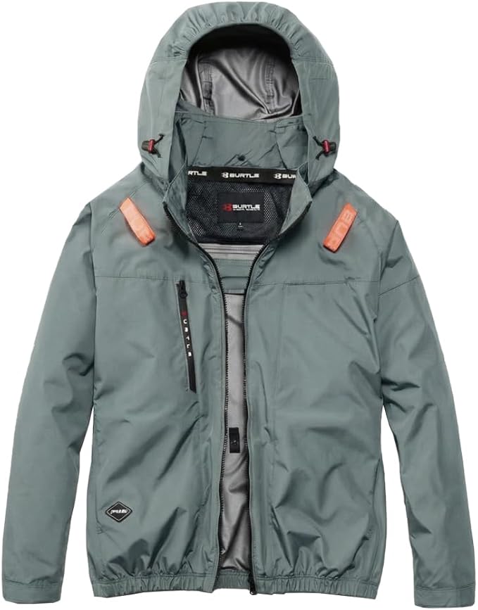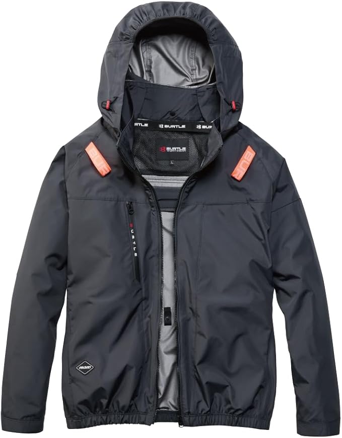 □ブルゾンデザイン:両脇サイドバックファン、フードプリント、大型フードスピンドル付き(ボタン止め着脱仕様)、バッテリー収納ポケット(右・ファスナー止めコードホール付)、ハーネスフックハンガー取付ベルト&取り出し口、胸ペンポケット、袖口カフスアジャスター、袖ペンポケット、内バッテリーポケット(左・マジックテープ止め)、ランヤード取付口、内側コードループ付、衿ダイレクトエアー