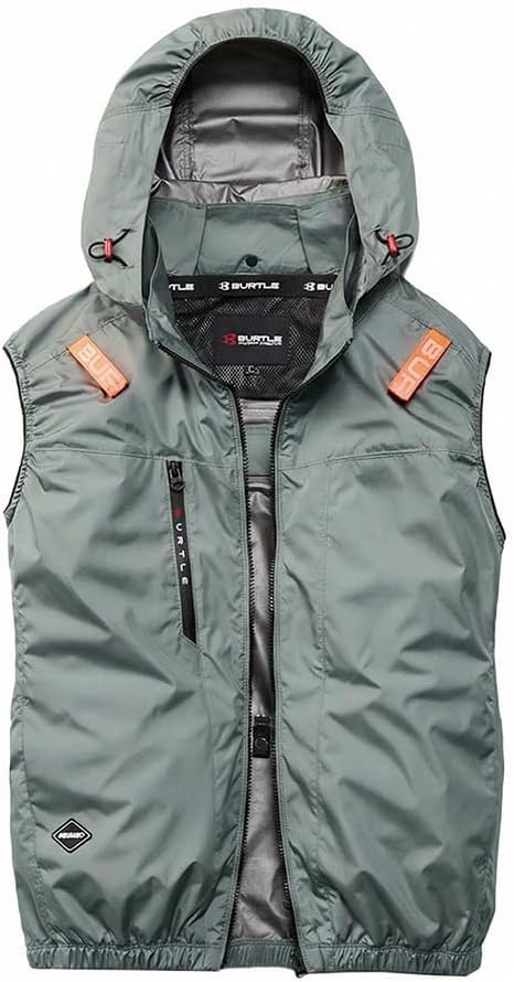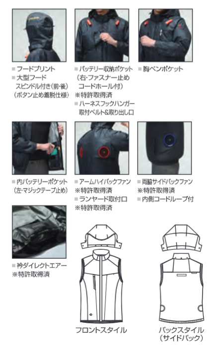 □ブルゾンデザイン:両脇サイドバックファン、フードプリント、大型フードスピンドル付き(ボタン止め着脱仕様)、バッテリー収納ポケット(右・ファスナー止めコードホール付)、ハーネスフックハンガー取付ベルト&取り出し口、胸ペンポケット、内バッテリーポケット(左・マジックテープ止め)、ランヤード取付口、内側コードループ付、衿ダイレクトエアー