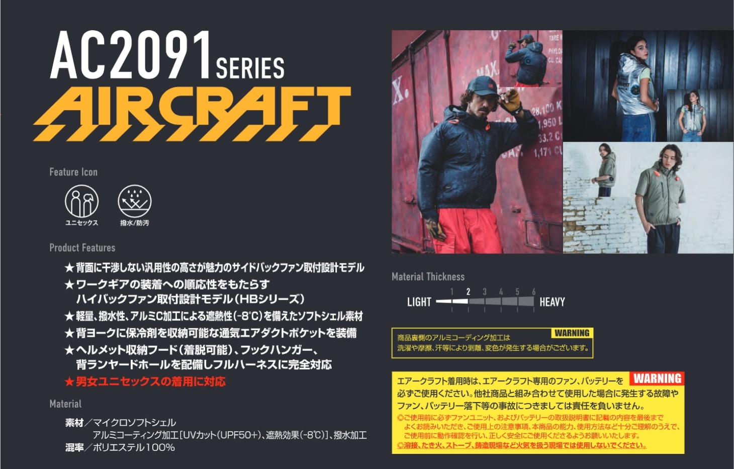 AIRCRAFT着用時はAIRCRAFT専用ファン・バッテリーを必ずご使用ください。他社製品と組み合わせて使用した場合に発生する故障やファン落下等の事故につきましては責任を負いません。その際は初期不良であってもサポート対象外とさせていただきます。