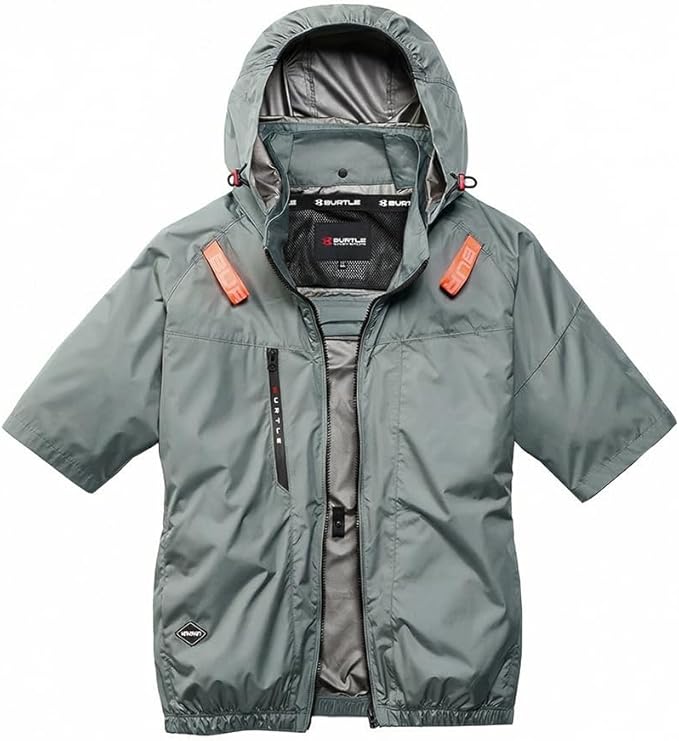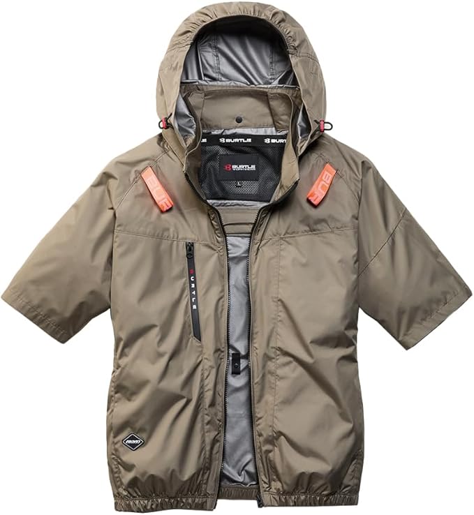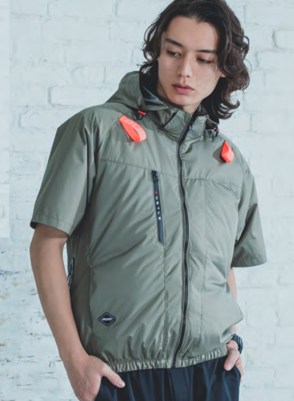 □ブルゾンデザイン:ハイバックファン、フードプリント、大型フードスピンドル付き(ボタン止め着脱仕様)、バッテリー収納ポケット(右・ファスナー止めコードホール付)、ハーネスフックハンガー取付ベルト&取り出し口、胸ペンポケット、袖ペンポケット、内バッテリーポケット(左・マジックテープ止め)、ランヤード取付口、内側コードループ付、衿ダイレクトエアー