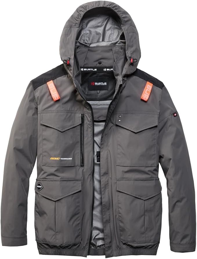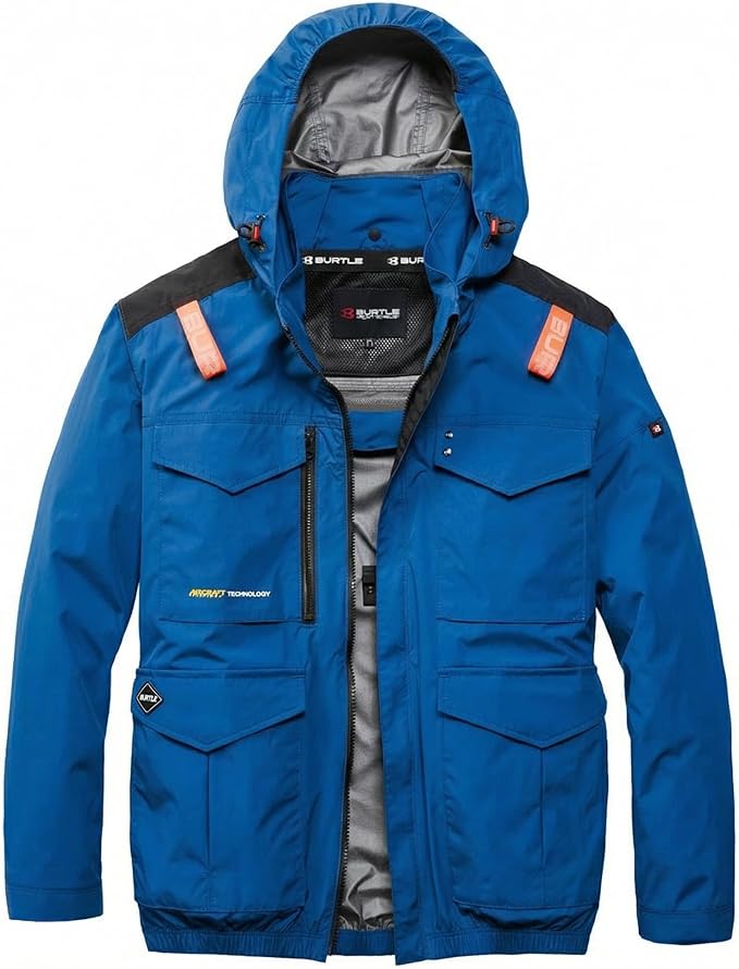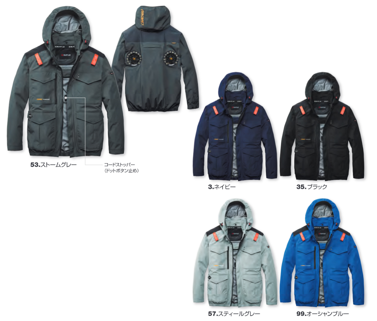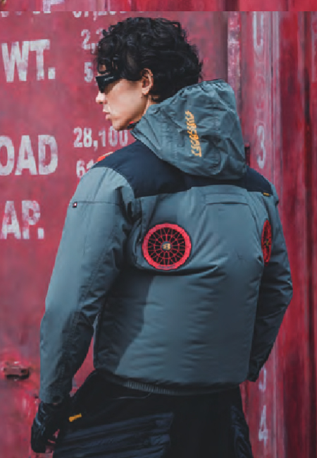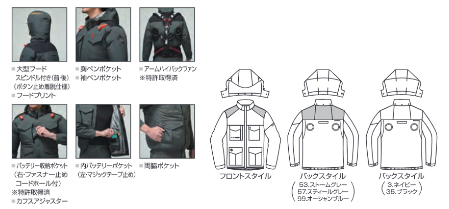 □ブルゾンデザイン:長袖ブルゾン、ハイバックファン、大型フードスピンドル付き(ボタン止め着脱仕様)、フードプリント、胸ペンポケット、袖ペンポケット、バッテリー収納ポケット(右・ファスナー止めコードホール付)、袖口カフスアジャスター、内バッテリーポケット(左・マジックテープ止め)、両脇ポケット、内側コードストッパー(ドットボタン止め)