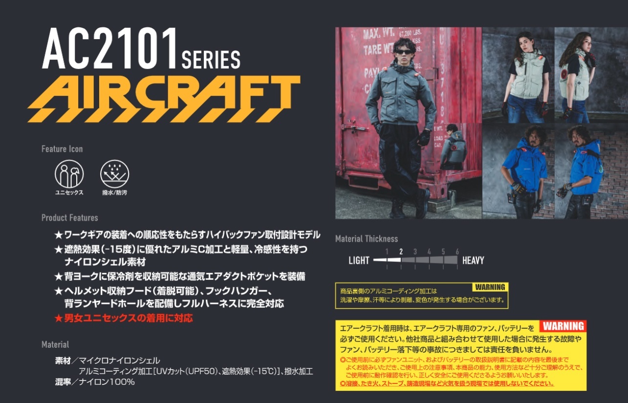 AIRCRAFT着用時はAIRCRAFT専用ファン・バッテリーを必ずご使用ください。他社製品と組み合わせて使用した場合に発生する故障やファン落下等の事故につきましては責任を負いません。その際は初期不良であってもサポート対象外とさせていただきます。