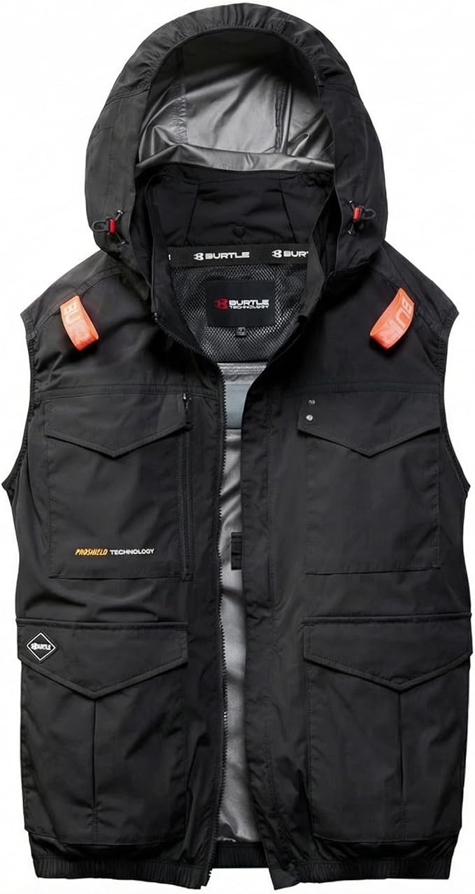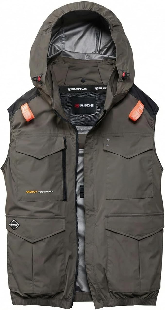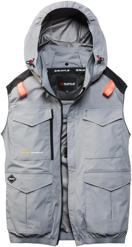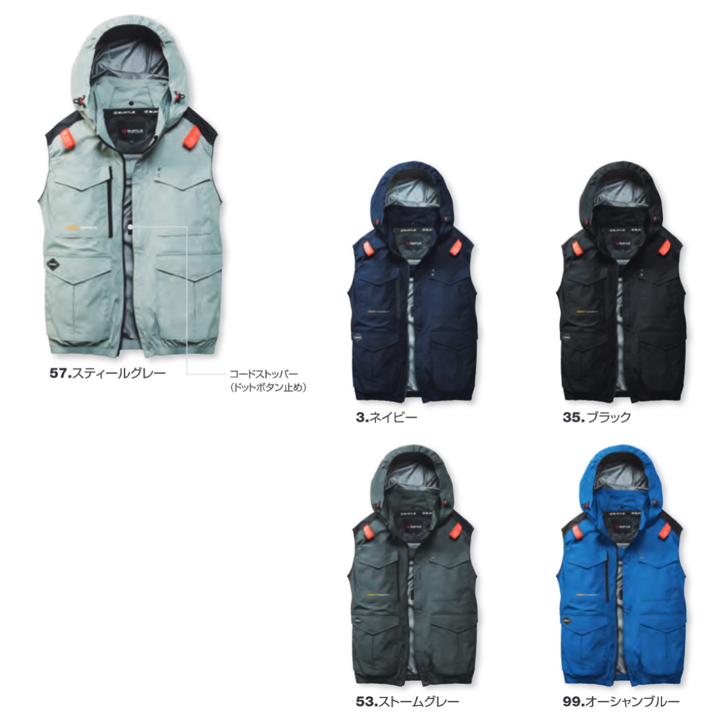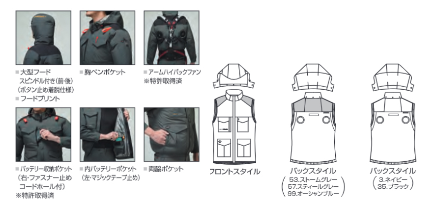 □ブルゾンデザイン:長袖ブルゾン、ハイバックファン、大型フードスピンドル付き(ボタン止め着脱仕様)、フードプリント、胸ペンポケット、バッテリー収納ポケット(右・ファスナー止めコードホール付)、内バッテリーポケット(左・マジックテープ止め)、両脇ポケット、内側コードストッパー(ドットボタン止め)