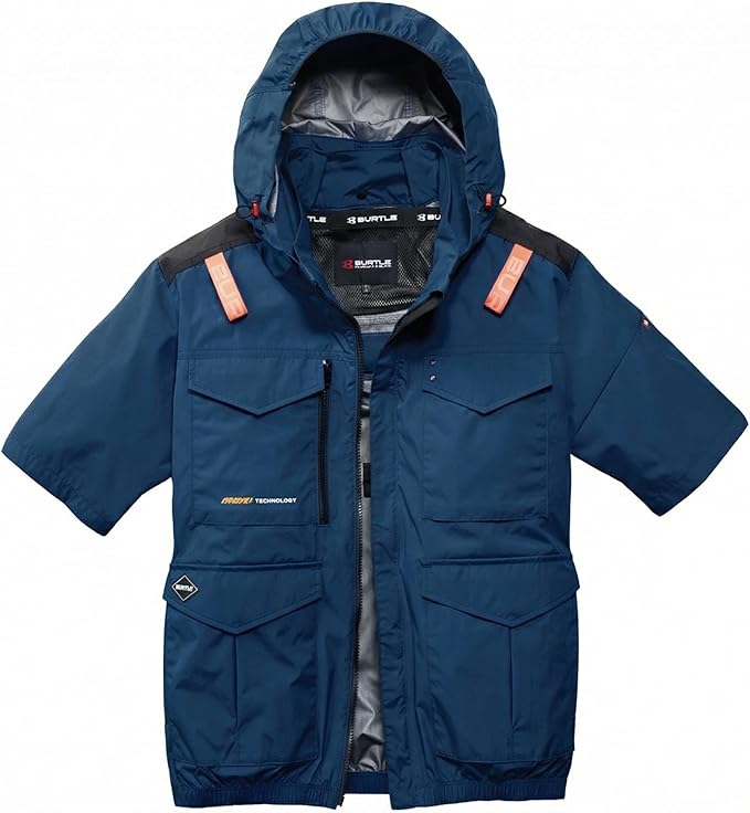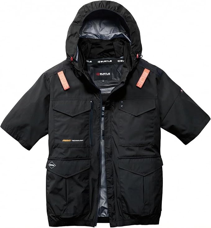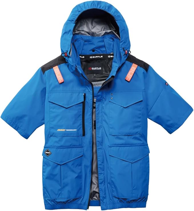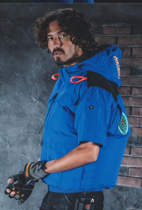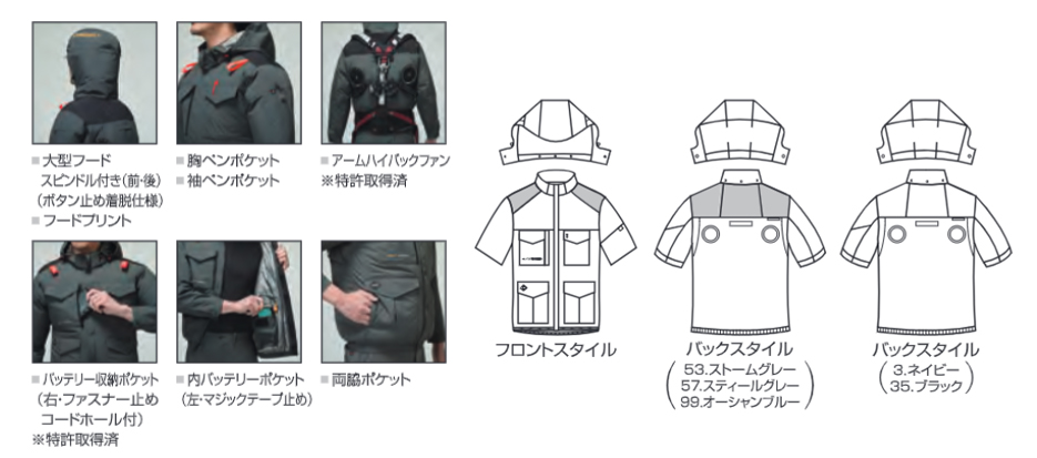 □ブルゾンデザイン:長袖ブルゾン、ハイバックファン、大型フードスピンドル付き(ボタン止め着脱仕様)、フードプリント、胸ペンポケット、袖ペンポケット、バッテリー収納ポケット(右・ファスナー止めコードホール付)、内バッテリーポケット(左・マジックテープ止め)、両脇ポケット、内側コードストッパー(ドットボタン止め)