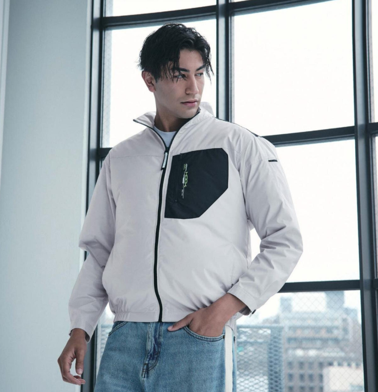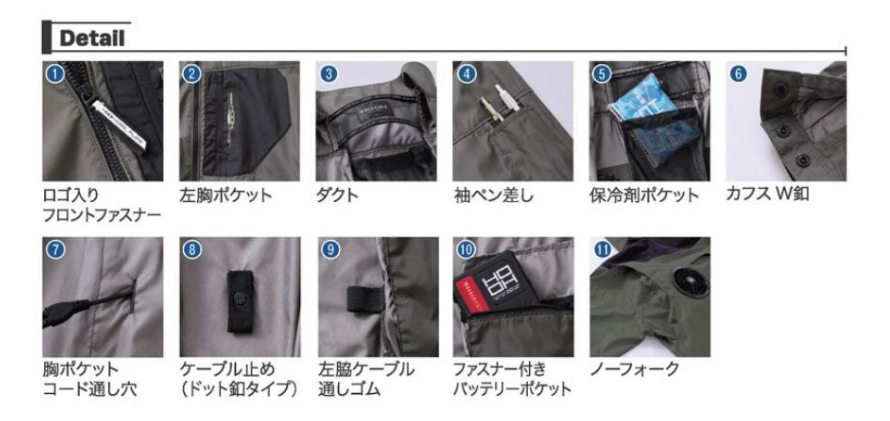 □ブルゾンデザイン:ミドルファン、ロゴ入りフロントファスナー、左胸ポケット(ファスナー付)、首元ダクト、袖ペン差し、保冷剤ポケット、カフスW釦、胸ポケットコード通し穴、ケーブル止め(ドット釦タイプ)、左脇ケーブル通しゴム、ファスナー付きバッテリーポケット、ノーフォーク