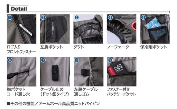 □ブルゾンデザイン:ミドルファン、ロゴ入りフロントファスナー、左胸ポケット(ファスナー付)、首元ダクト、保冷剤ポケット、胸ポケットコード通し穴、ケーブル止め(ドット釦タイプ)、左脇ケーブル通しゴム、ファスナー付きバッテリーポケット、ノーフォーク、アームホール高品質ニットパイピン