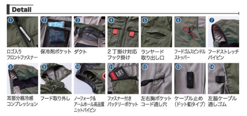 □ブルゾンデザイン:ロゴ入りフロントファスナー、保冷剤ポケット、首元ダクト、2丁掛け対応フック掛け、ランヤード取り出し口、フードゴムスピンドルストッパー、フードストレッチパイピン、耳部分綿冷感コンプレッション、フード取り外し、ノーフォーク&アームホール高品質ニットパイピン、ファスナー付きバッテリーポケット、左右胸ポケットコード通し穴、ケーブル止め(ドット釦タイプ)、左脇ケーブル通しゴム