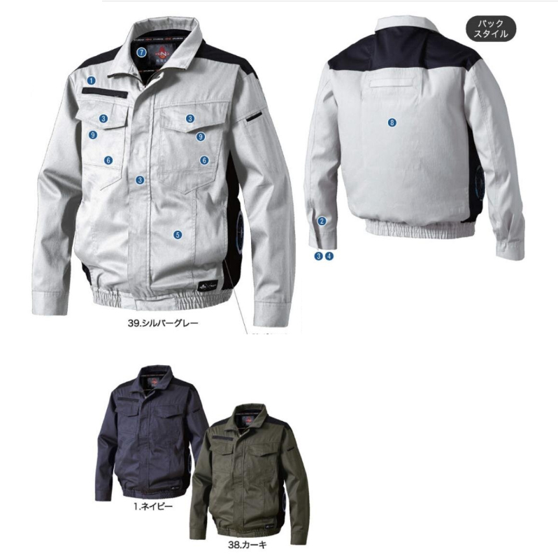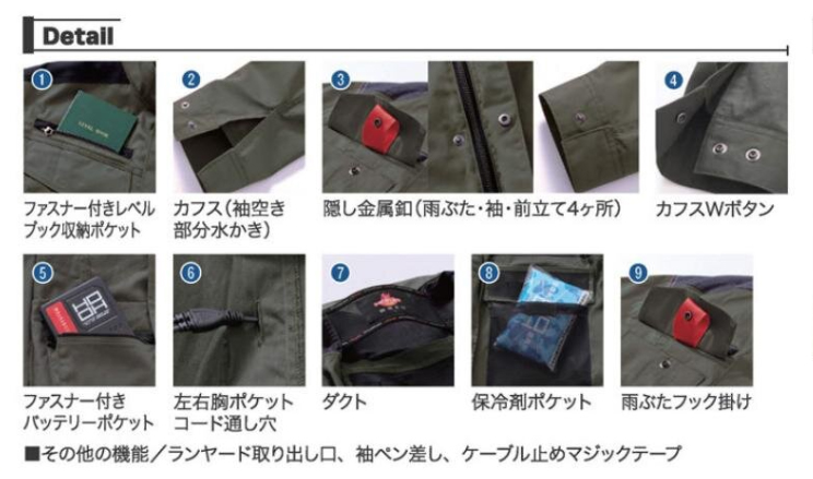 □ブルゾンデザイン:長袖ブルゾン、ファスナー付きレベルブック収納ポケット、カフス(袖空き部分水かき)、隠し金属釦(雨ぶた・袖・前立て4ヶ所)、カフスWボタン、ファスナー付きバッテリーポケット、左右胸ポケットコード通し穴、首元ダクト、保冷剤ポケット、雨ぶたフック掛け、ランヤード取り出し口、袖ペン差し、ケーブル止めマジックテープ