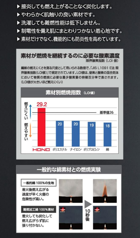 ☆フルハーネス対応の「HONO」は難燃加工綿100%で作られた耐炎・耐熱・制電性に優れた素材です。