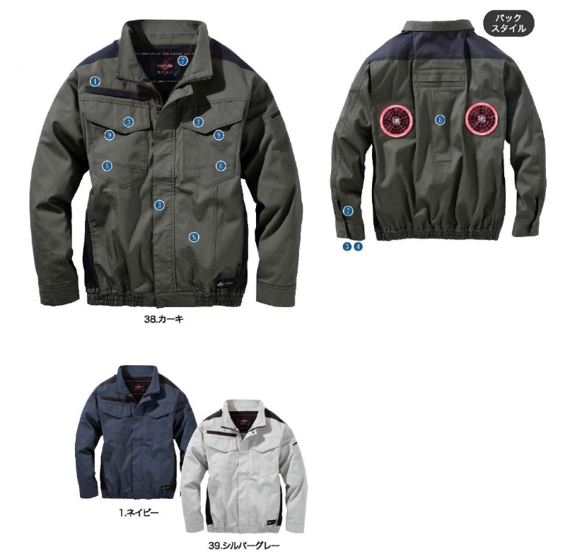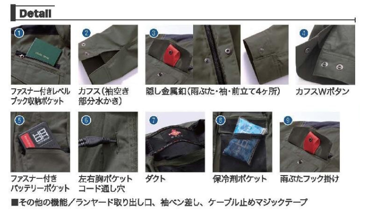 □ブルゾンデザイン:長袖ブルゾン、ファスナー付きレベルブック収納ポケット、カフス(袖空き部分水かき)、隠し金属釦(雨ぶた・袖・前立て4ヶ所)、カフスWボタン、ファスナー付きバッテリーポケット、左右胸ポケットコード通し穴、首元ダクト、保冷剤ポケット、雨ぶたフック掛け、ランヤード取り出し口、袖ペン差し、ケーブル止めマジックテープ