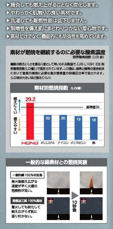 ☆フルハーネス対応の「HONO」は難燃加工綿100%で作られた耐炎・耐熱・制電性に優れた素材です。