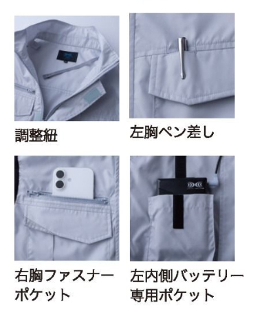 □ブルゾンデザイン:ベスト、首元調整紐、右胸ファスナーポケット、左胸ペン差し、左内側バッテリー専用ポケット、男女兼用